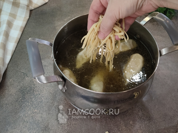 Добавляем лапшу, она приготовится менее, чем за минуту.