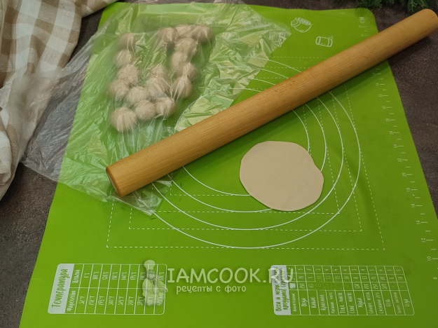 От общего куска теста отрежьте порцию, примерно половину, может чуть больше, скатайте колбаску, нарежьте на кусочки. Заготовки теста не забывайте прикрывать пленкой, чтобы тесто не подсыхало. Каждую заготовку раскатываем в тонкий круг.