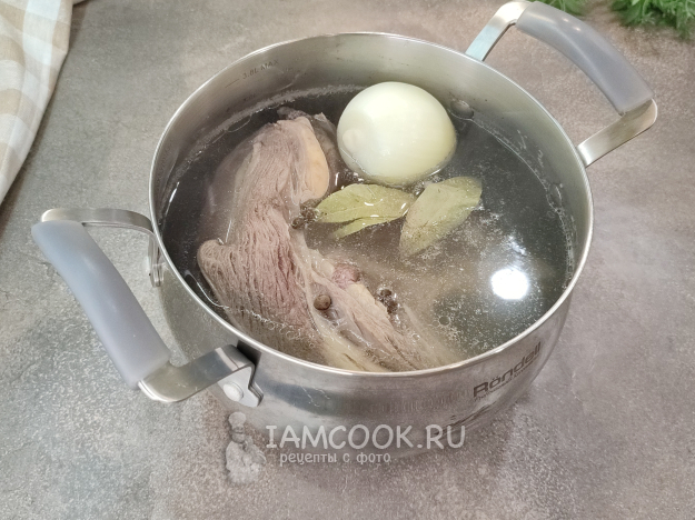 Мясо залейте холодной водой, отправьте на плиту. Варка мяса - это самый долгий процесс в данном рецепте, занимает не менее двух часов.