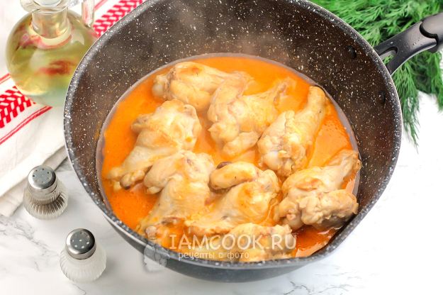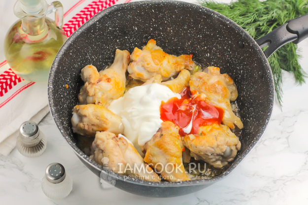 Влейте немного горячей воды и перемешайте. Убавьте нагрев до умеренного и протомите куриные плечики в подливе на сковороде, под крышкой 5-8 минут. При сильном нагреве сметана может свернуться.