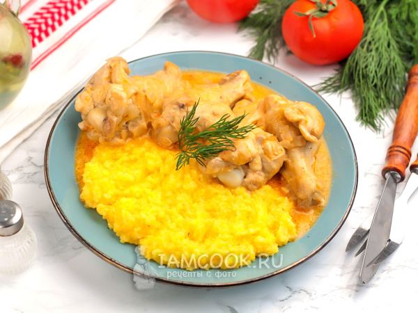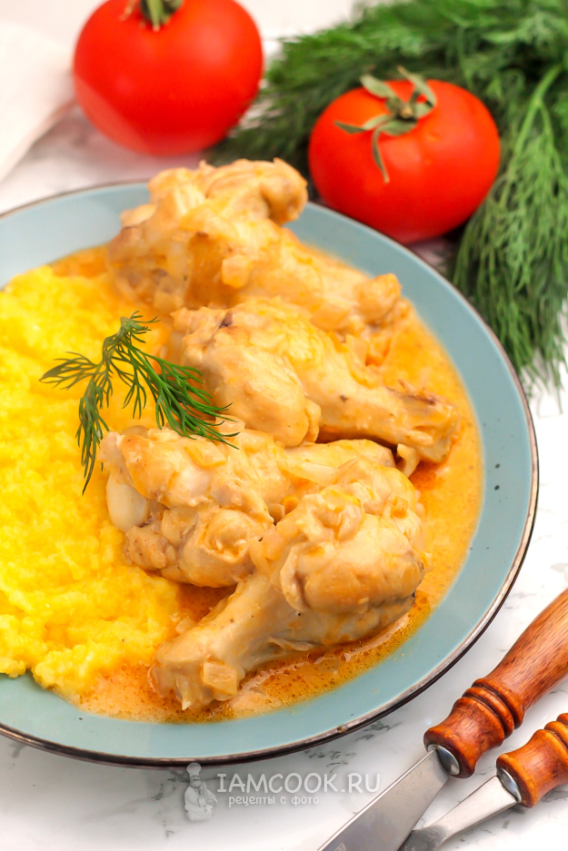 Выложите курицу с подливой в тарелки и дополните любым гарниром из круп, макарон, овощей. Подайте к столу в теплом виде.