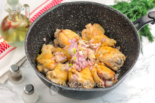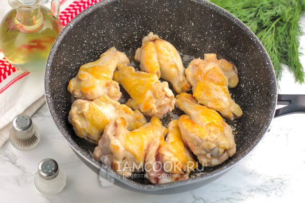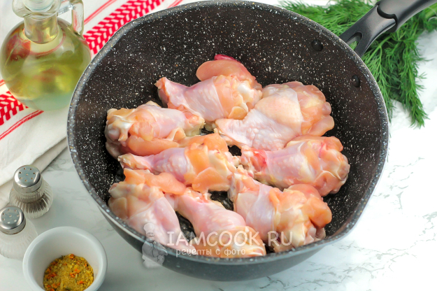 Плечики промойте в воде и обсушите бумажными салфетками, удаляя лишнюю влагу. Прогрейте в сковороде растительное масло и выложите в него куриные части. Обжарьте в течение 15 минут, время от времени перемешивая. Сковороду прикройте крышкой, чтобы не разбрызгивался жир во все стороны.