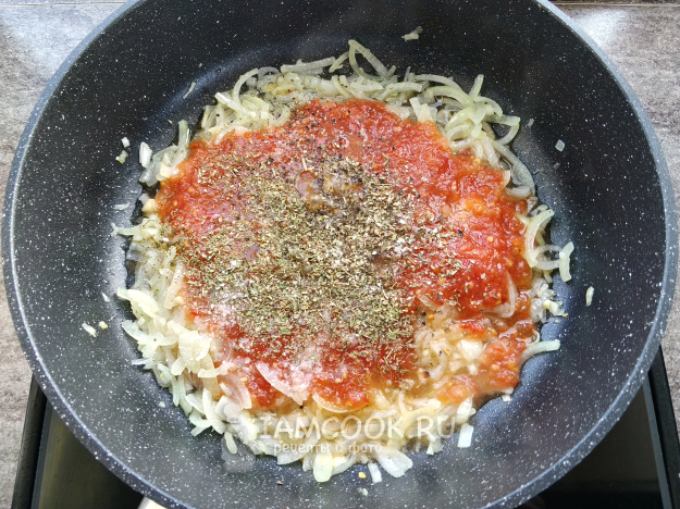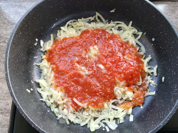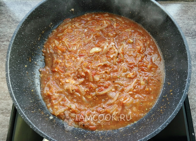 Томаты у меня были уже измельченные (заготовка на зиму). Можно взять свежие помидоры или в собственном соку и также измельчить в блендере или мелко нарезать.