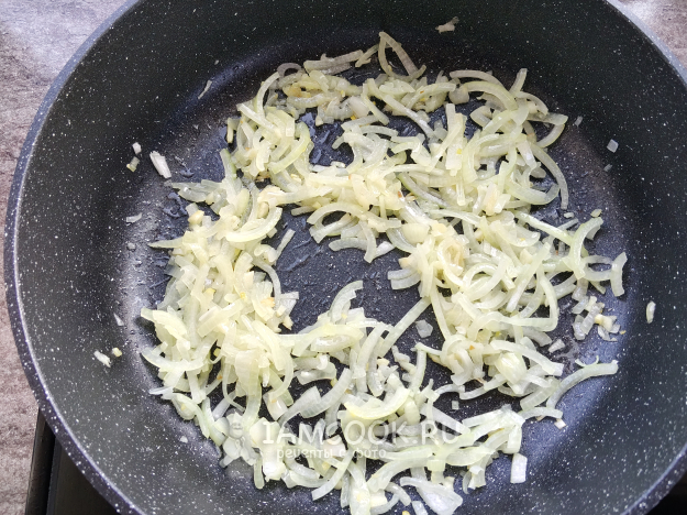 Обжарить на масле, помешивая, пока лук не станет мягким.