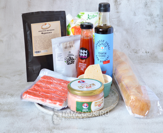Соберите необходимые ингредиенты для приготовления ленивых суши на багете в духовке. Духовку разогреть до 180°С.
