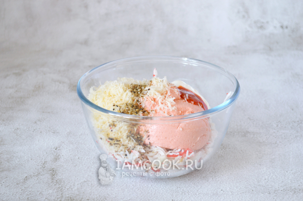 Добавить икру мойвы, сыр, натертый на мелкой терке, майонез, соус шрирача и японские специи фурикакэ. Все тщательно перемешать.