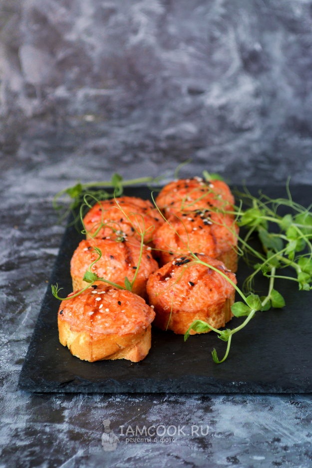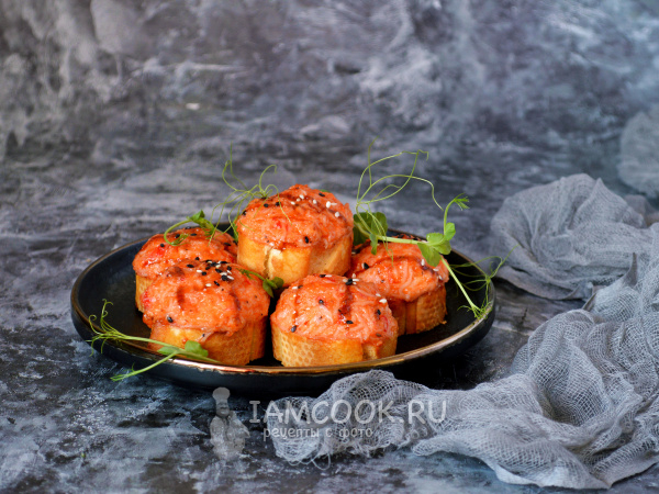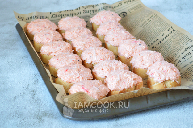 Выложить начинку на ломтики багета, формируя красивую "шапочку". Выложить ленивые суши на багете на противень и отправить в духовку на 15-20 минут, до легкого зарумянивания.