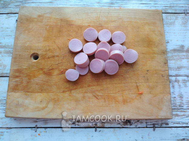 Сосиски нарезать кружочками.