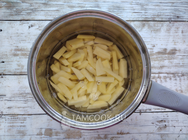 Овощи почистить, картофель нарезать соломкой. Промыть картофельную соломку, чтобы бульон был прозрачным. Залить фильтрованной водой, поставить на огонь.