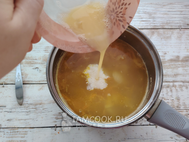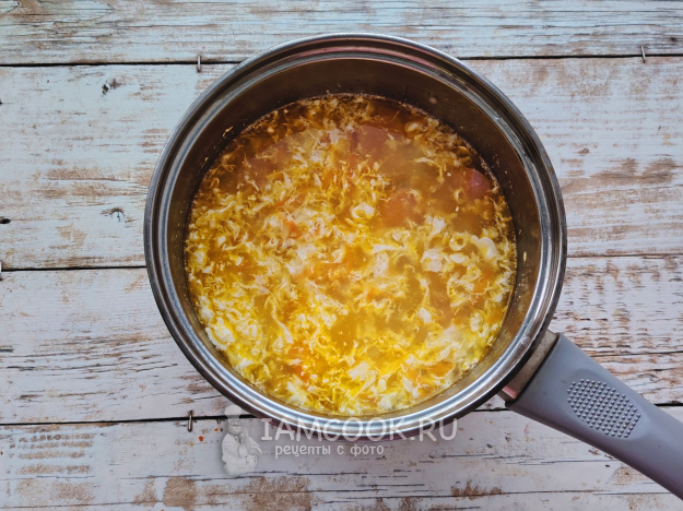 Влить яичную смесь в бульон, сразу перемешать суп.