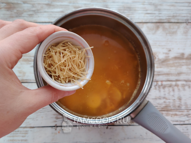 Следом отправить вермишель в кастрюлю, перемешать сразу, чтобы вермишель не прилипла ко дну кастрюли.