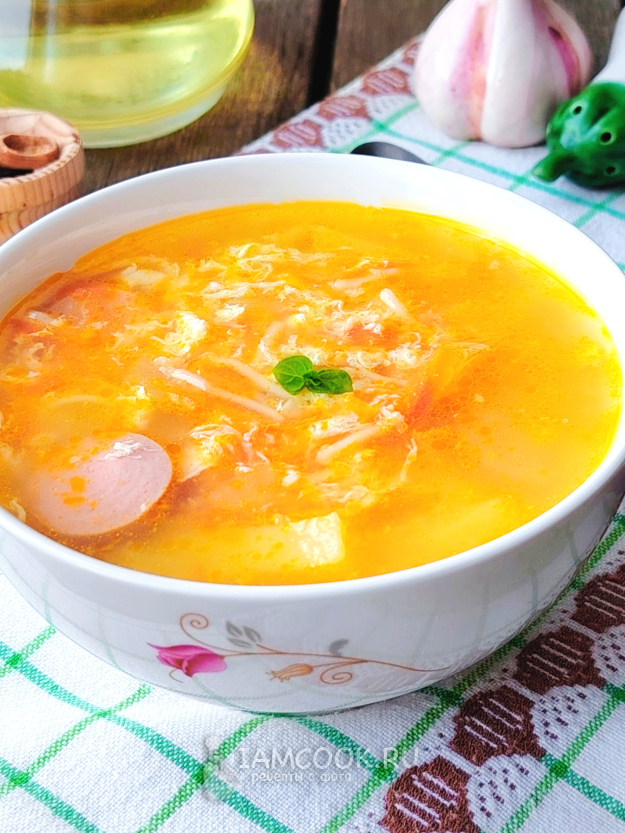 Продолжить варку супа с сосисками и яйцом еще около 7-10 минут. Выключить огонь.