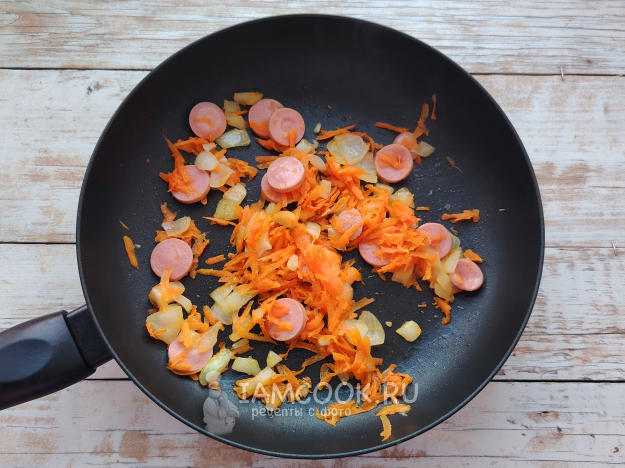 Добавить кружочки сосисок к овощной зажарке, дать им слегка зарумяниться.