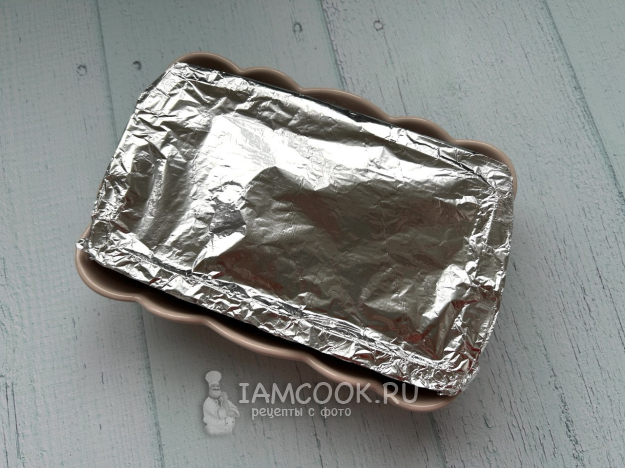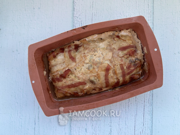 Сверху накройте полосками бекона. Форму для запекания накройте фольгой.