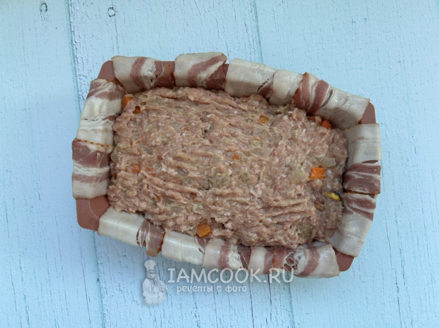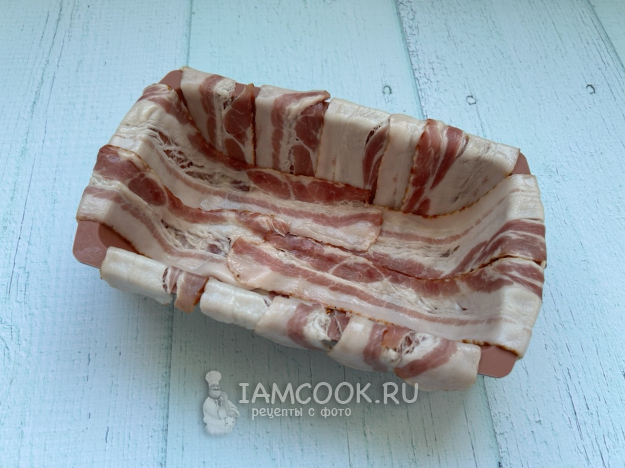 В форму для запекания выложите полоски бекона так, чтобы низ был полностью ими покрыт, а края свисали.