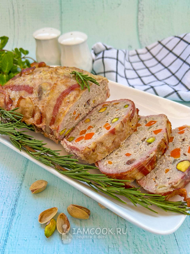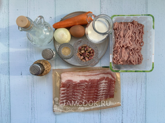 Соберите все необходимые ингредиенты для приготовления террина из индейки с фисташками в беконе по списку.