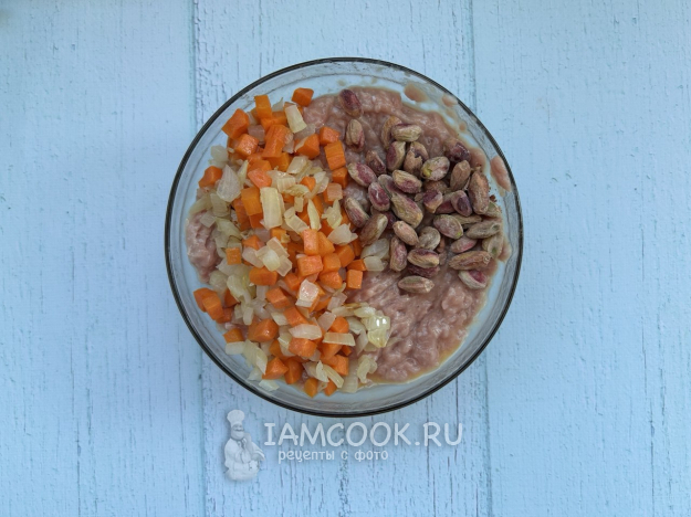 Затем добавьте обжаренный лук с морковью и фисташки. Тщательно перемешайте массу до однородности.