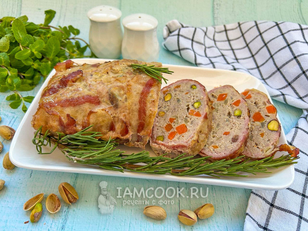 Установите форму с террином в форму большего размера, влейте горячую воду до половины. Запекайте террин из индейки с фисташками в беконе в предварительно разогретой духовке при температуре 180°C примерно 50-60 минут, до готовности. За 10 минут до готовности снимите фольгу и допеките, чтобы бекон зарумянился.