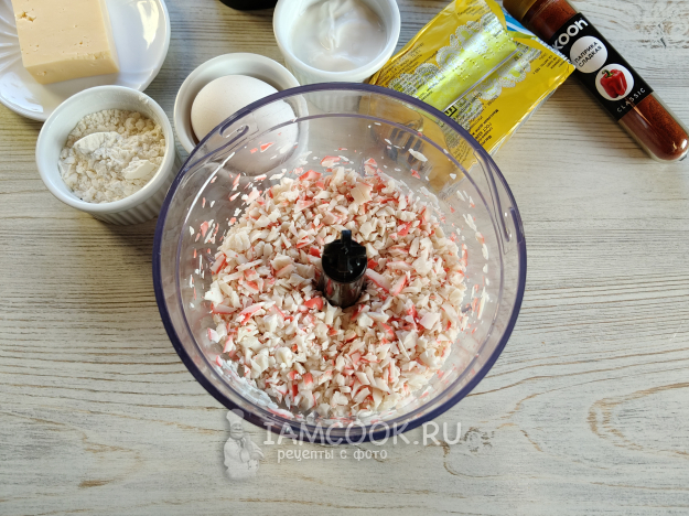 Крабовые палочки измельчить в блендере или мелко нарезать.