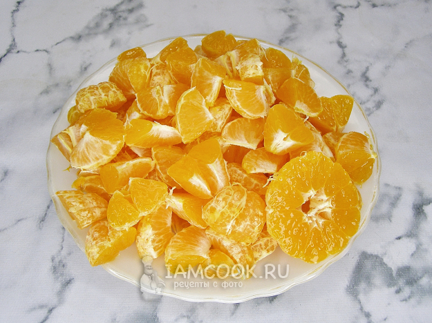 Мандарины очищаем от кожуры, разрезаем вдоль пополам и разделяем на дольки.