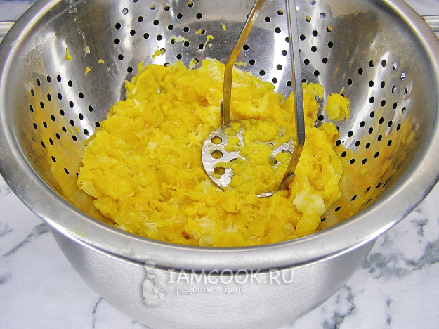 Перекладываем мандарины в дуршлаг и с помощью толкушки отжимаем из них сок. Для того чтобы сок получился однородным, без кусочков мякоти, его можно процедить через мелкое сито или марлю. Приготовленный сок убираем на время в холодильник.