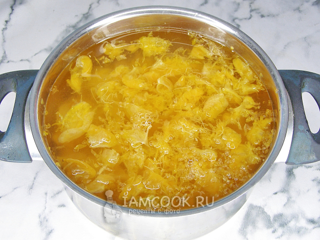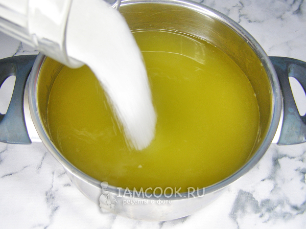 В ещё горячий мандариновый отвар всыпаем сахар, перемешиваем, чтобы сахар полностью растворился, и оставляем остывать до комнатной температуры.
