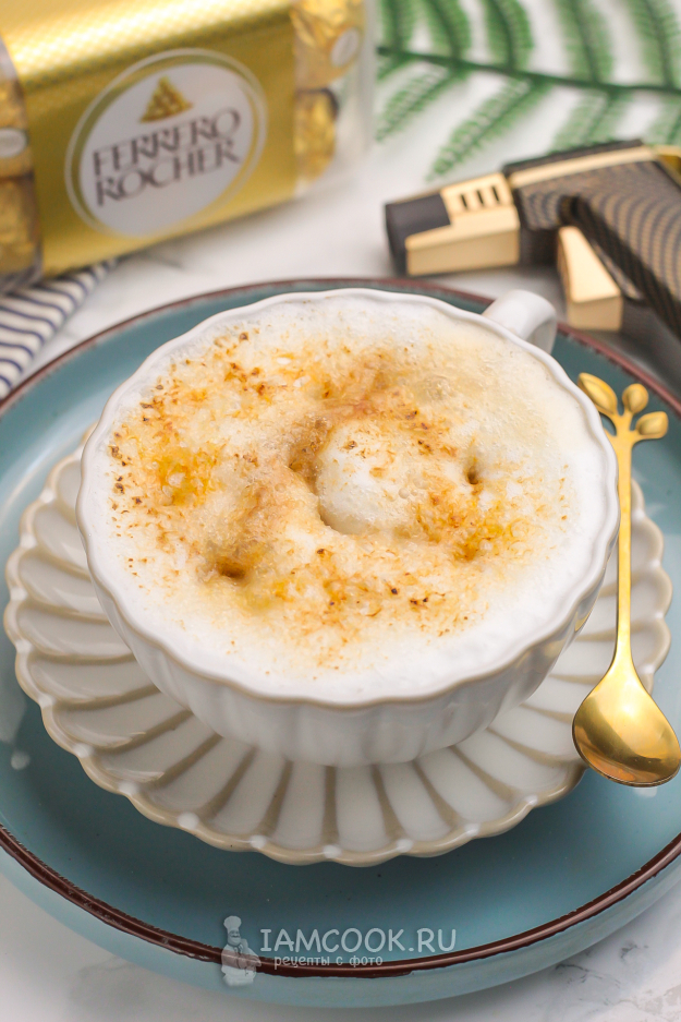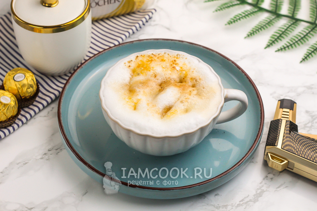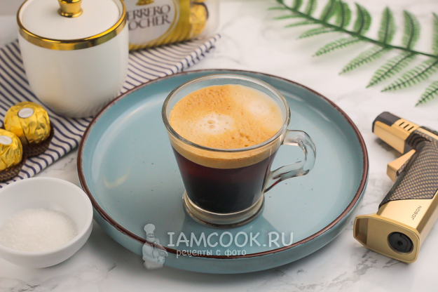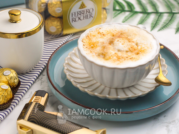 В некоторых местах карамель будет тонуть в напитке. Присыпьте еще сахара и снова подожгите, запеките до карамели. Затем сразу же подайте запаянный кофе к столу, подождав до дегустации 1 минуту, чтобы карамель чуть остыла.
