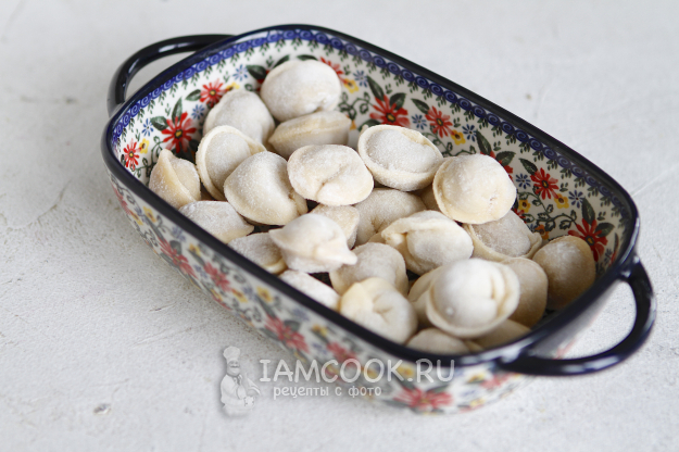 Ну вот, теперь переходим к основному процессу. Удобнее готовить пельмени в форме и в один слой. Поэтому подберите подходящую по размеру форму для вашего аэрогриля. Выложите в нее замороженные пельмени.