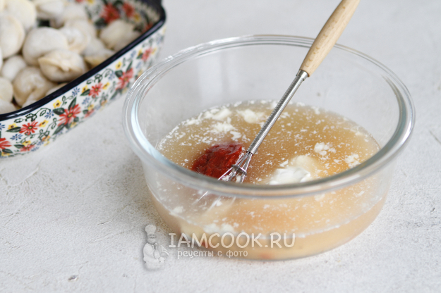 В отдельной чаше смешайте кетчуп с майонезом и влейте бульон. Если под рукой не будет готового бульона, то влейте обычную кипяченую воду. Тщательно перемешайте все ингредиенты венчиком.