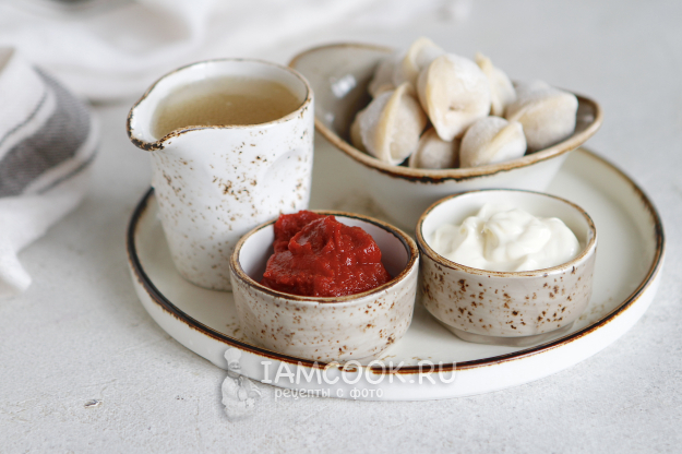 Соберите все необходимые ингредиенты для приготовления пельменей в аэрогриле с кетчупом и майонезом.