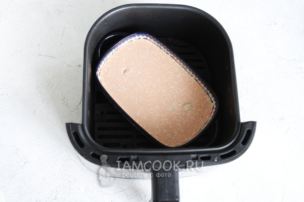 Установите форму в чашу аэрогриля. Форму можно прикрыть фольгой или крышкой, если такая имеется у вас. Я форму ничем не прикрывала.