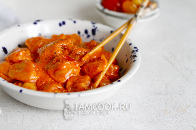 Готовые пельмени вместе с соусом выложите на тарелку и подавайте к столу. Пельмени с кетчупом и майонезом получаются очень сытными. Если любите пельмени, обязательно приготовьте их по этому рецепту.
