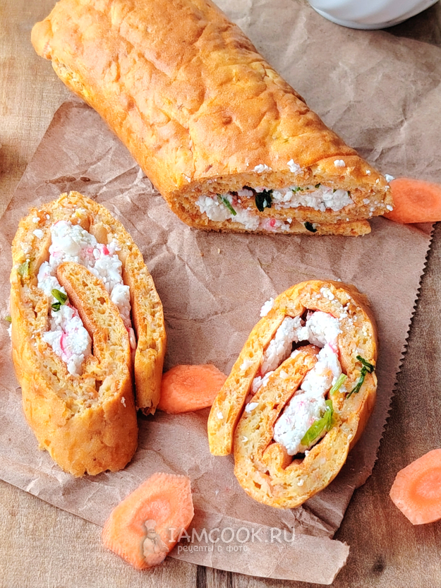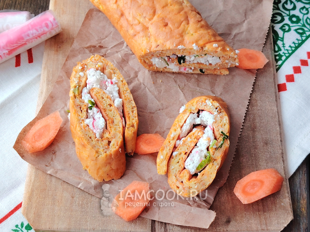 Подать морковный рулет с крабовыми палочками к столу. Приятного аппетита!