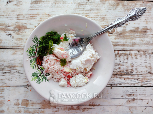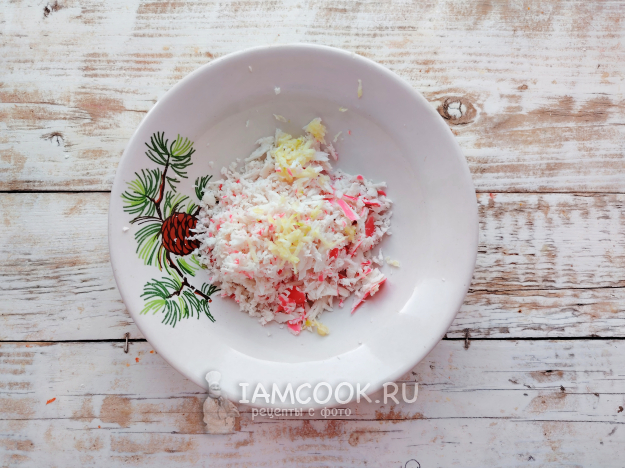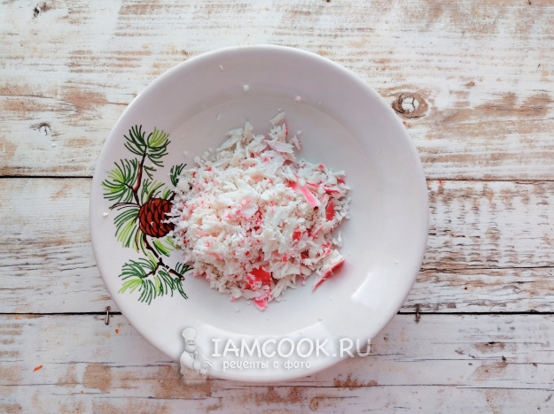 Подготовить начинку. Крабовые палочки натереть на мелкой терке.