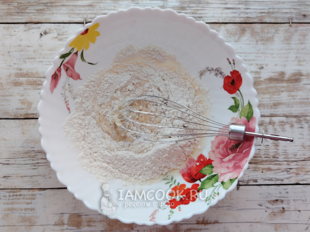 Всыпать отмеренное количество муки, просеянной и соединенной с разрыхлителем.