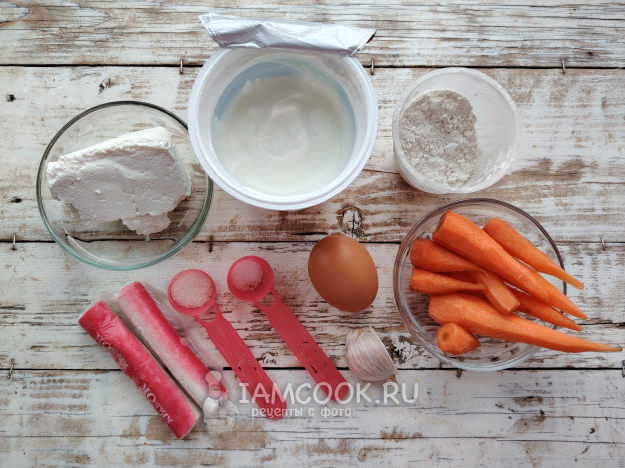 Собрать по списку продукты для морковного рулета с крабовыми палочками.