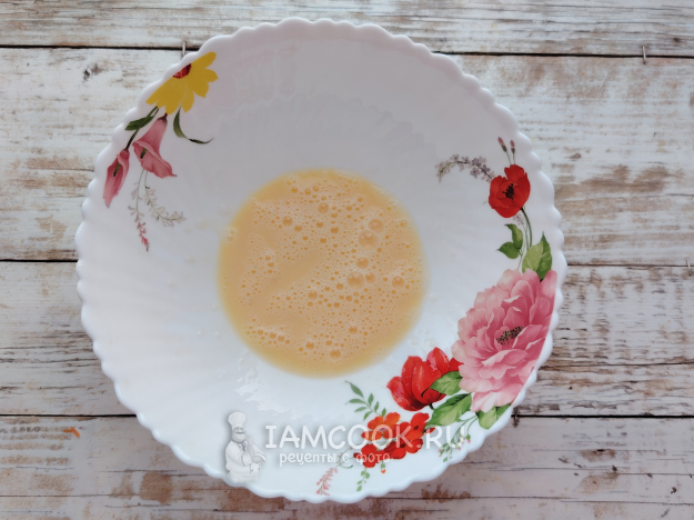 Яйца вбить в глубокую миску. Венчиком со щепоткой соли размешать их до образования небольшой пены.