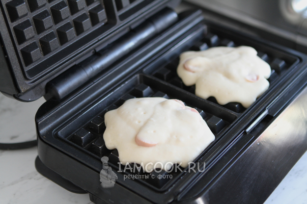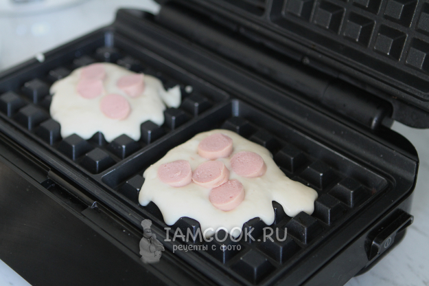 И добавьте еще немного теста, чтобы закрыть сосиски. Закройте крышку вафельницы и выпекайте вафли примерно 3-4 минуты, до золотистого цвета. Если вы не уверены в работе своей вафельницы и опасаетесь, что вафли могут прилипнуть к поверхности панелей, то перед каждым выпеканием рекомендую смазывать панели маслом.