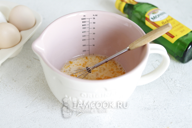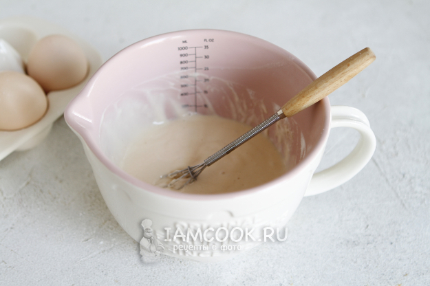 Влейте молоко. Венчиком взбейте молоко с яйцом.