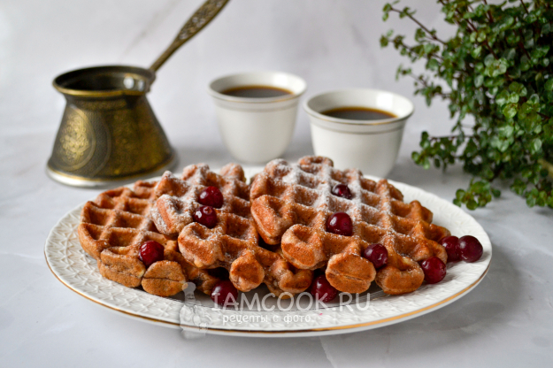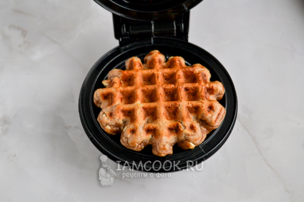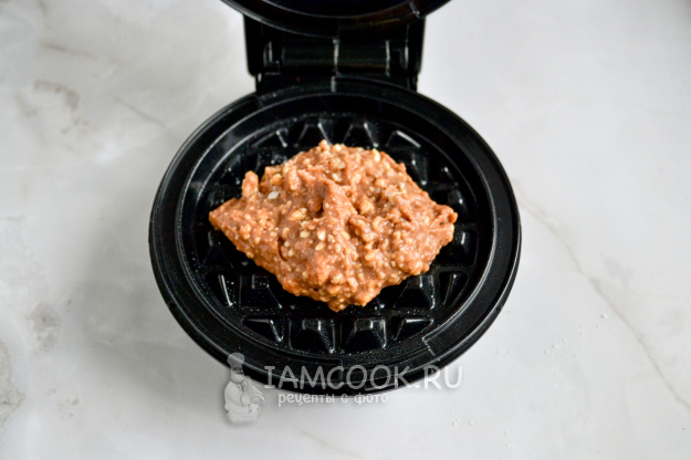 Разогрейте электровафельницу. Смажьте панели минимальным количеством растительного масла, положите полную столовую ложку теста на одну вафлю.