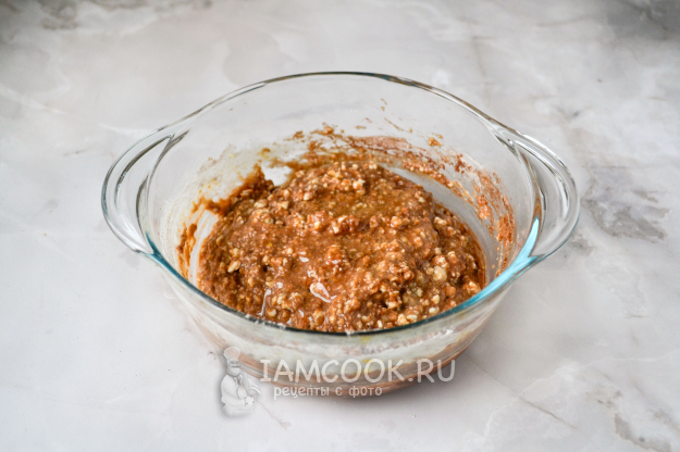 Еще раз тщательно перемешайте творожную массу с мукой и какао-порошком. Влейте растительное масло и еще раз перемешайте.