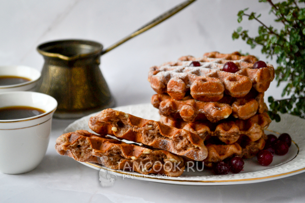 Выпекайте творожно-шоколадные вафли в вафельнице до румяности. Я выпекала 5-6 минут.