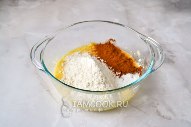 Всыпьте пшеничную муку, разрыхлитель и какао-порошок.