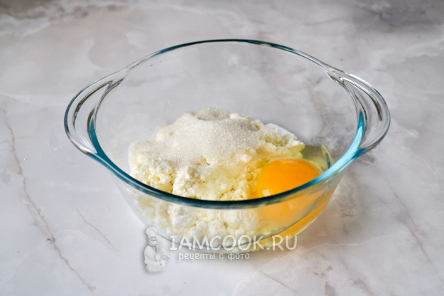 В миску положите творог, сахар, разбейте яйцо, щепотку соли.