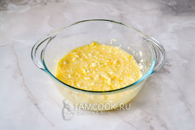 Тщательно разотрите творог с яйцом и сахаром до однородной консистенции.