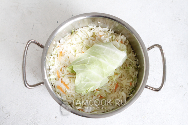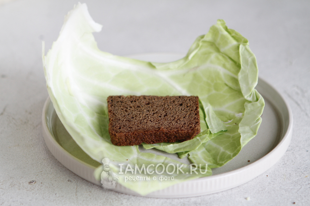 На дно кастрюли или контейнера выложите капустный лист с хлебом.