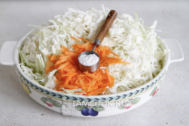 Смешайте морковь с капустой и взвесьте все вместе. Добавьте соль. Напоминаю: на 1 кг добавляем 20 г соли.