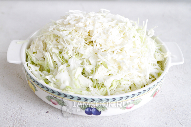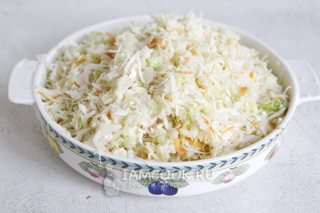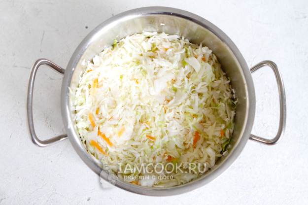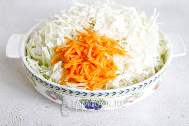 Перемешайте капусту с морковью и слегка помните ее руками, чтобы капуста дала сок.