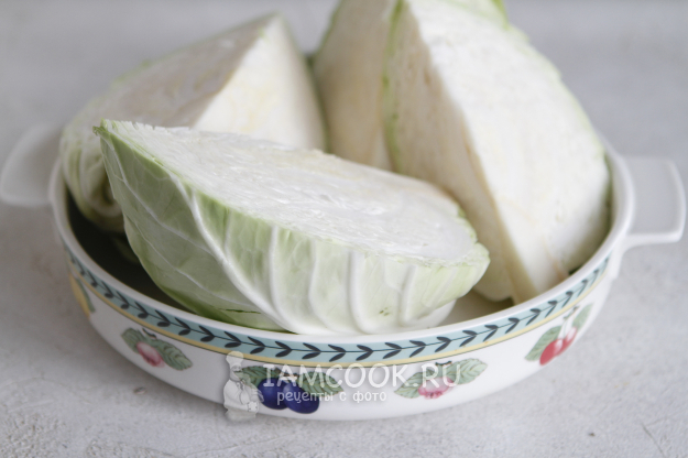 Кочан капусты разрежьте пополам и каждую половинку - еще раз пополам. Удалите кочерыжку.