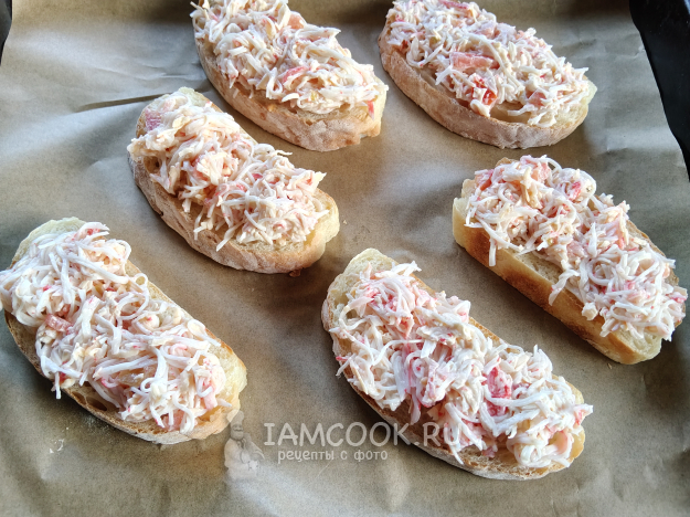 Щедро разложить крабовую начинку на хлебные кусочки.